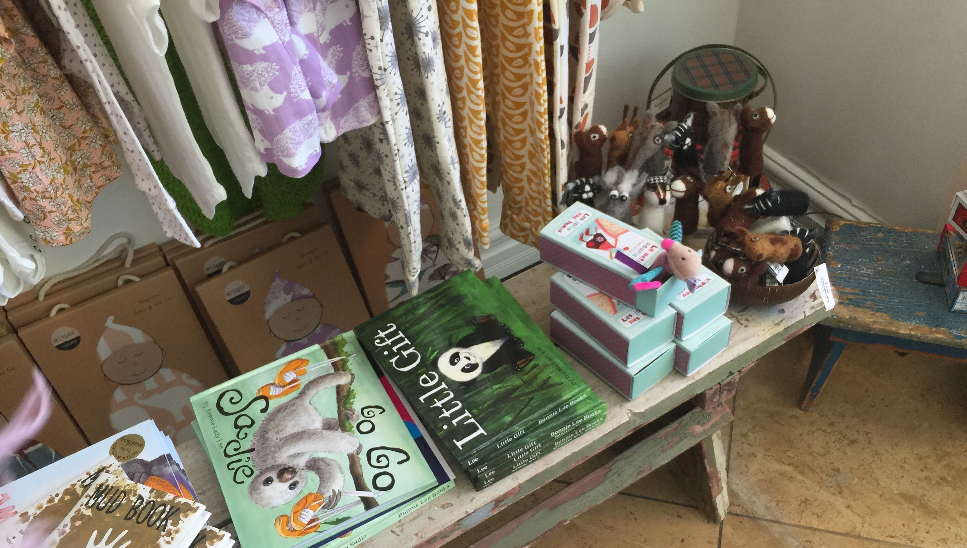 Inside, the store has women’s clothing and jewelry to drool over. But tucked in a corner near that front window, are lots of cute baby blankets, picture books and little felt toys perched on antique furniture displays.