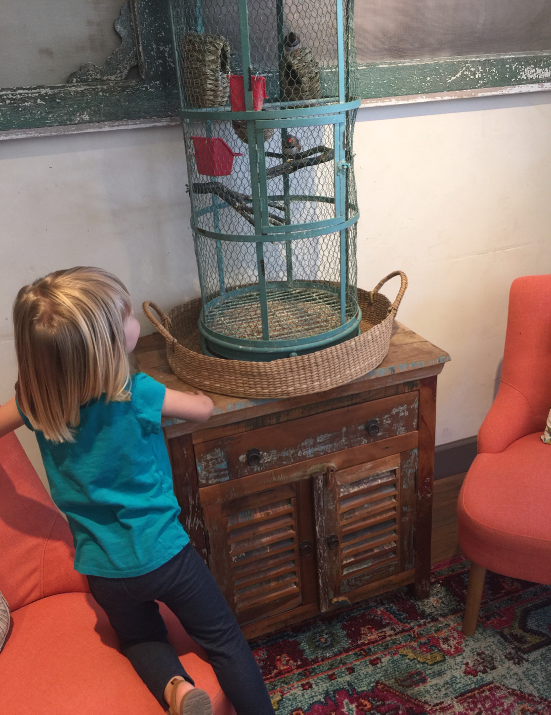 But that’s not why my 3 year old likes it (she’ll see the light one day). For right now, she likes it because the shop is where we visit our favorite little downtown birdies – Summer and Fern. This sweet pair of feathery finches have their own adorable vintage metal birdcage near the store’s front window. These shop birds have intricate markings and hop and chatter and are just a delight to watch. We heart them.