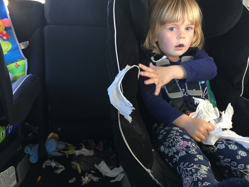 My second option was to buckle them in the car seats, and drive to the restrooms only to get them out 10 seconds later and really piss them off.