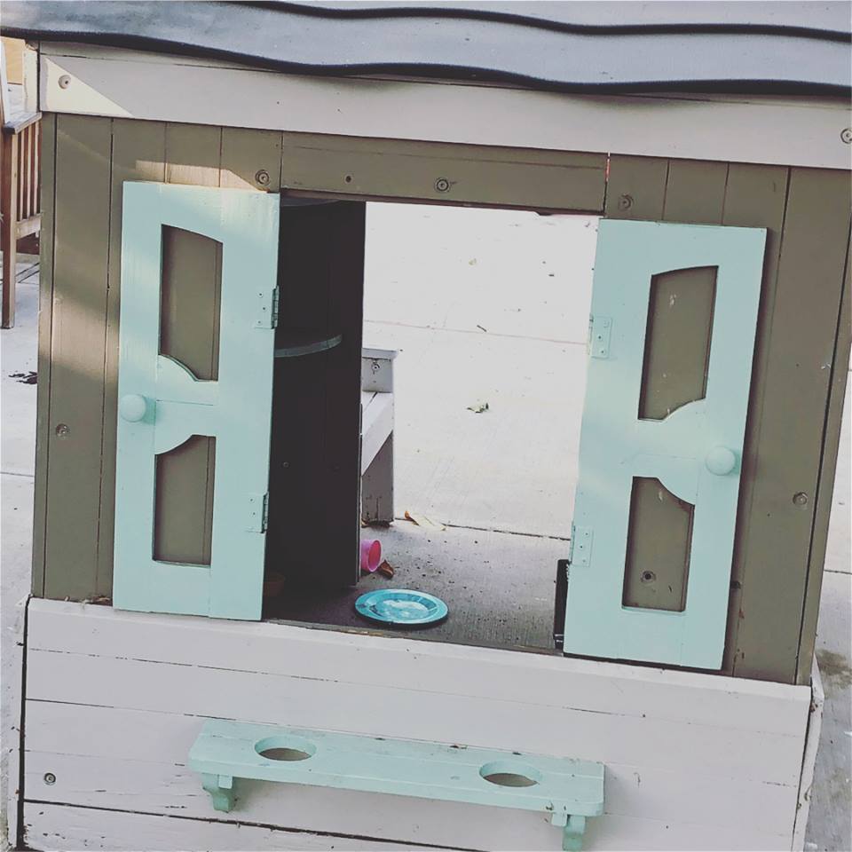I added a new mailbox, fixed the broken parts, power washed it, primed it, painted it, painted the roof, awkwardly squatted inside the house to paint the interior, added a toy basket, and my mom even sewed handmaid curtains for it.