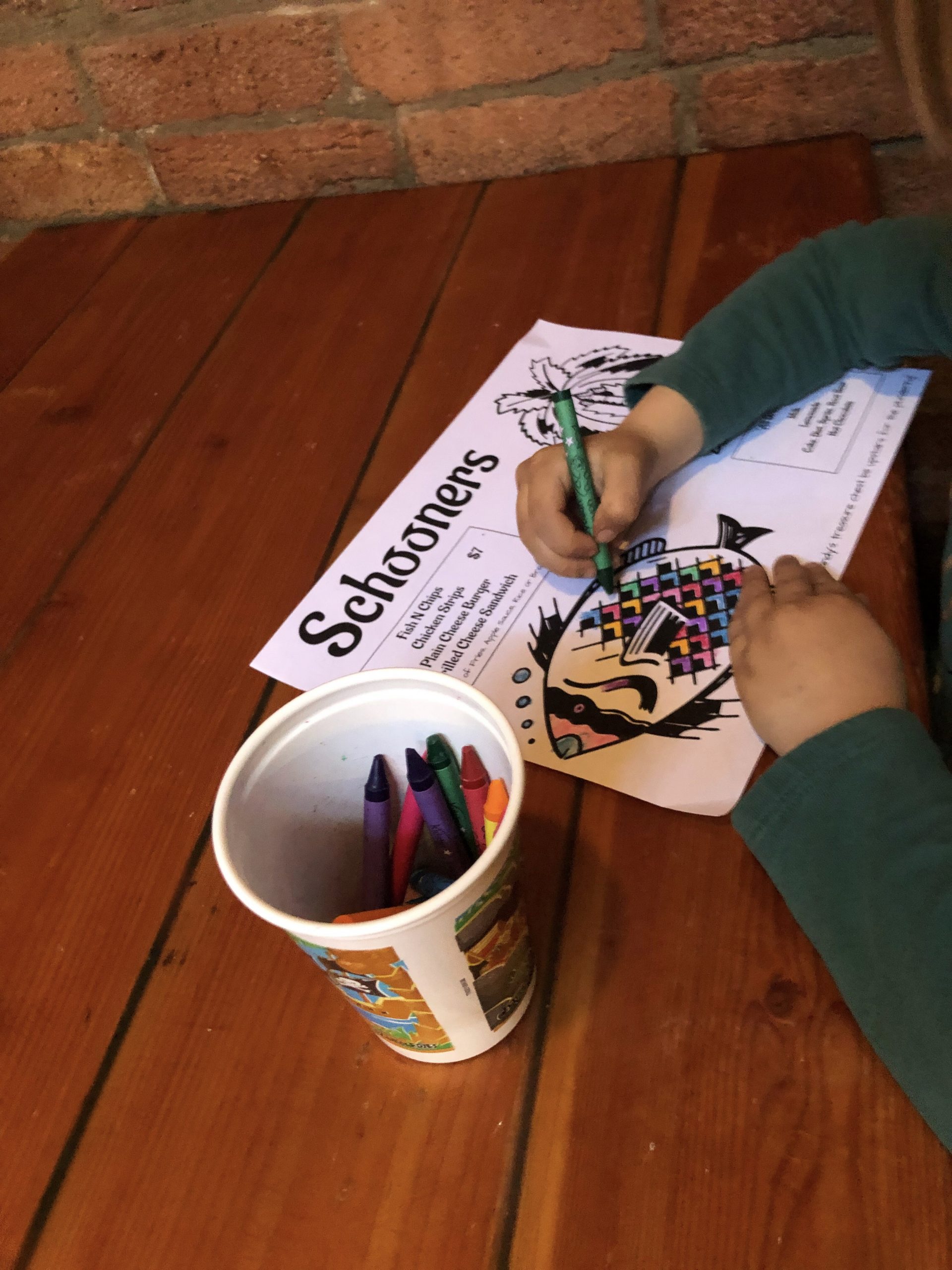 I appreciated the atmosphere of fun things to look at, the kids menu, the plastic kid cups with straws and the assortment of super cute ocean-related coloring pages and crayons at the table.