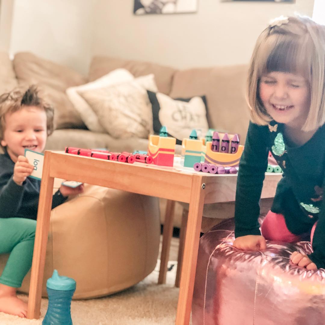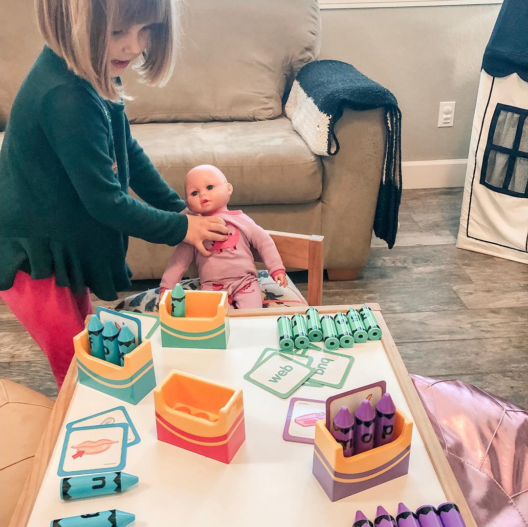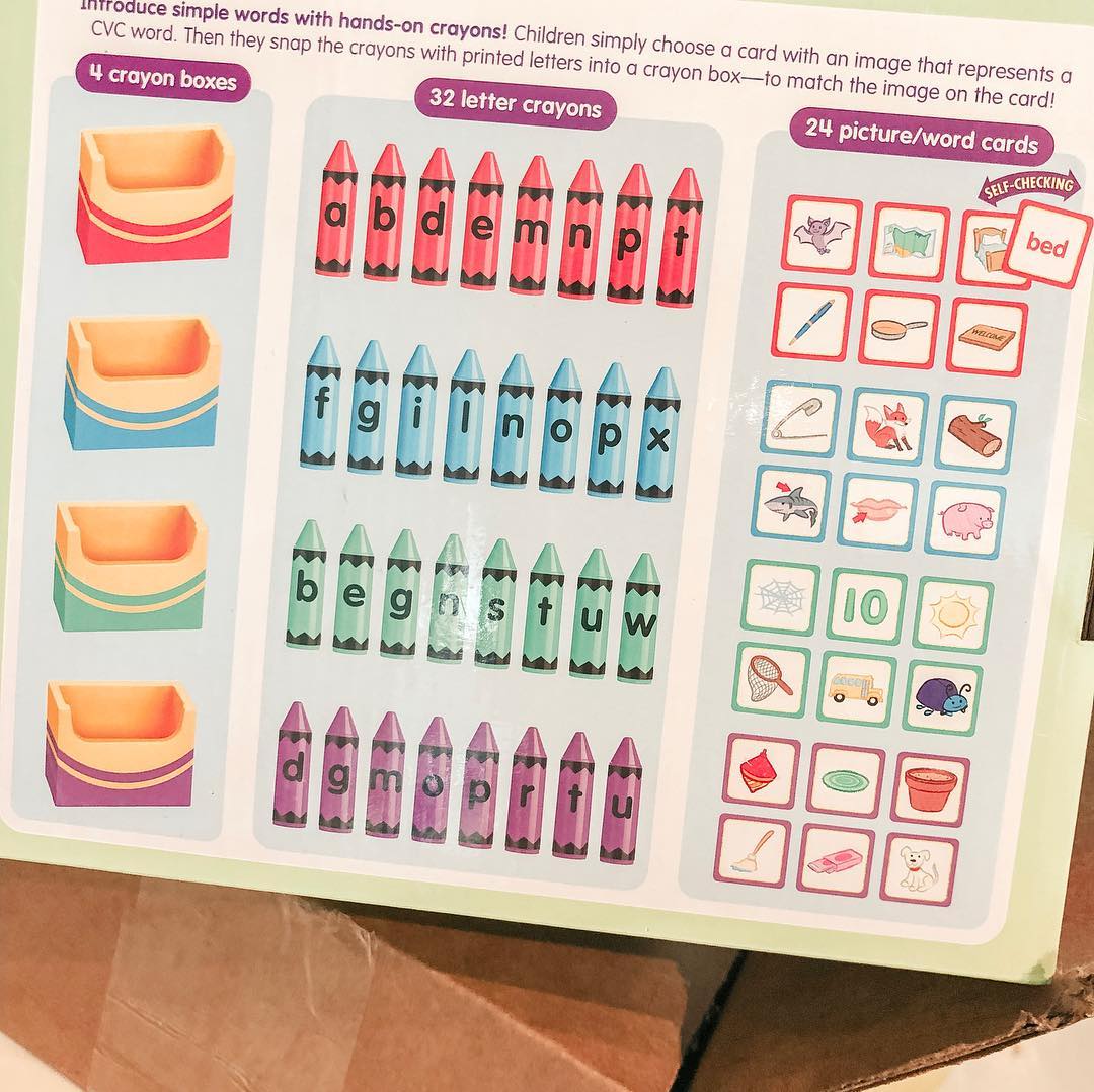 This Letter Crayons Word Building Center is made for ages 3 to 6, which is exciting to find one toy that’s perfect for Clara and Wyatt’s range. This toy comes with animal cards that include the word and a picture, and then four “crayon” boxes with plastic crayon toys, each with a letter printed in them, to spell what kids see on the card.