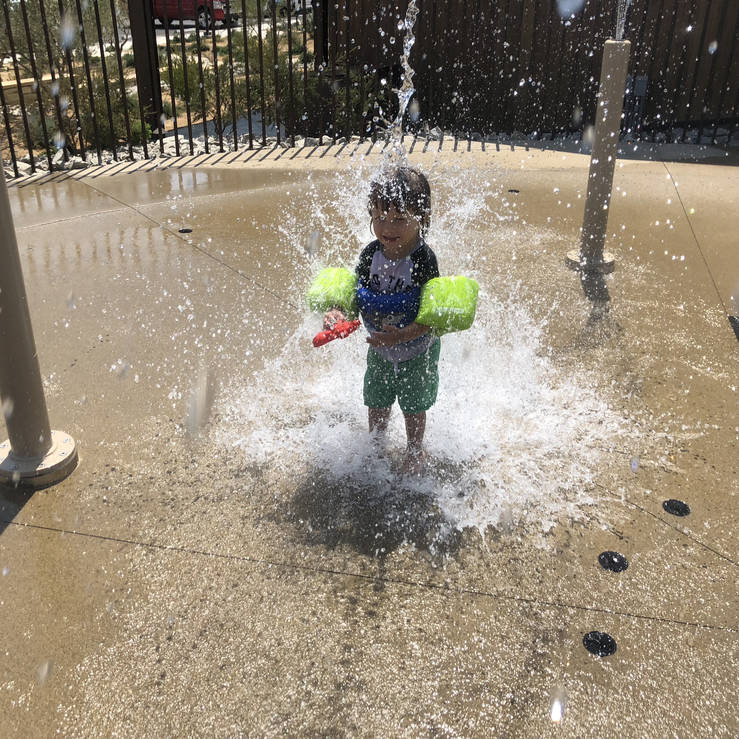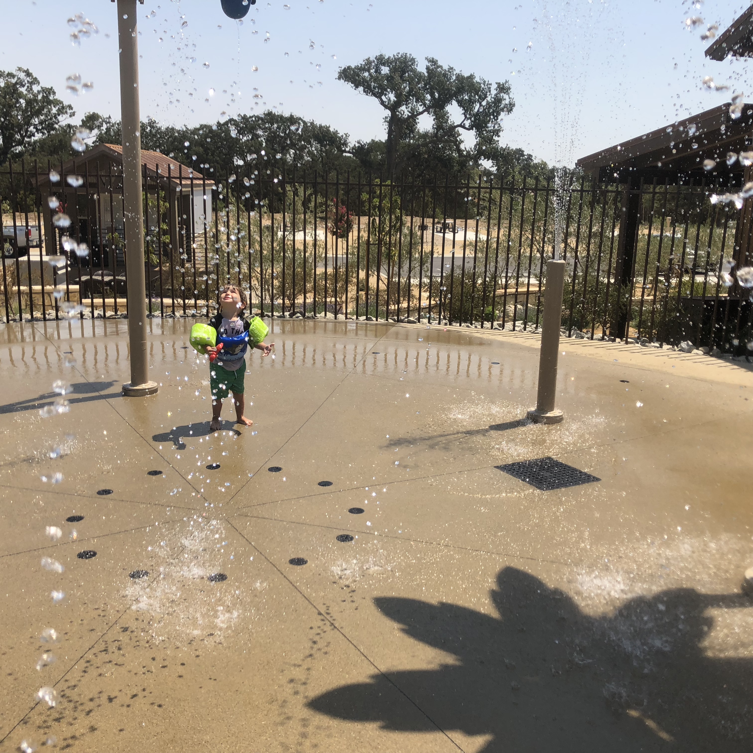 The Grand Oaks Clubhouse is also home to the splash pad and putting green. Hint: The secret to turning on the splash pad is to stomp on that black circle on the floor, located to the left of Wyatt in the middle photo. Who knew? But we sure looked funny trying to figure it out.