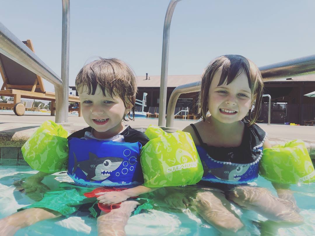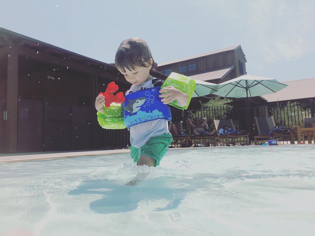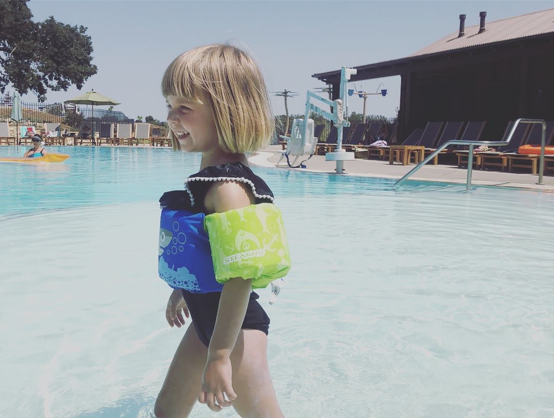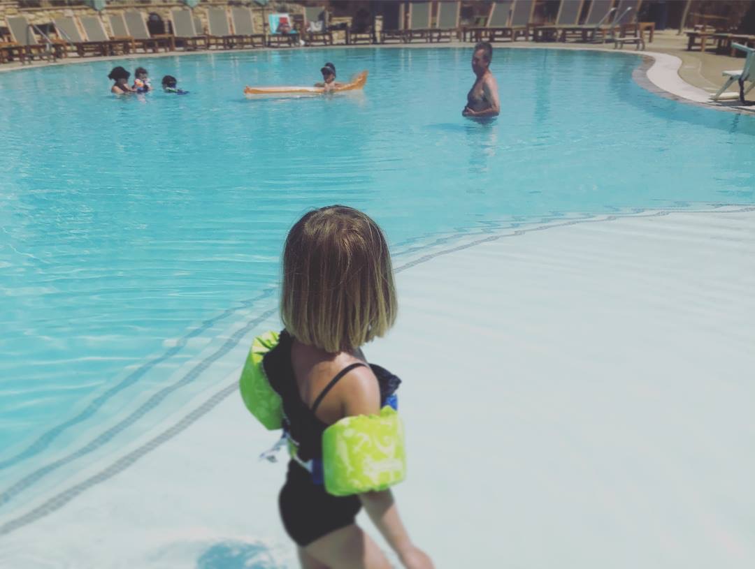 Not only is it beautiful, but the main pool is also great for little kids. That’s because about a third of its entrance is only 10 inches of water, making for a lovely wading platform to play and splash in. Then, that opens up to stairs that take swimmers down to about 3 and 5 feet of water. For that, we brought our own Puddle Jumpers, which help the kids stay afloat in deeper water.