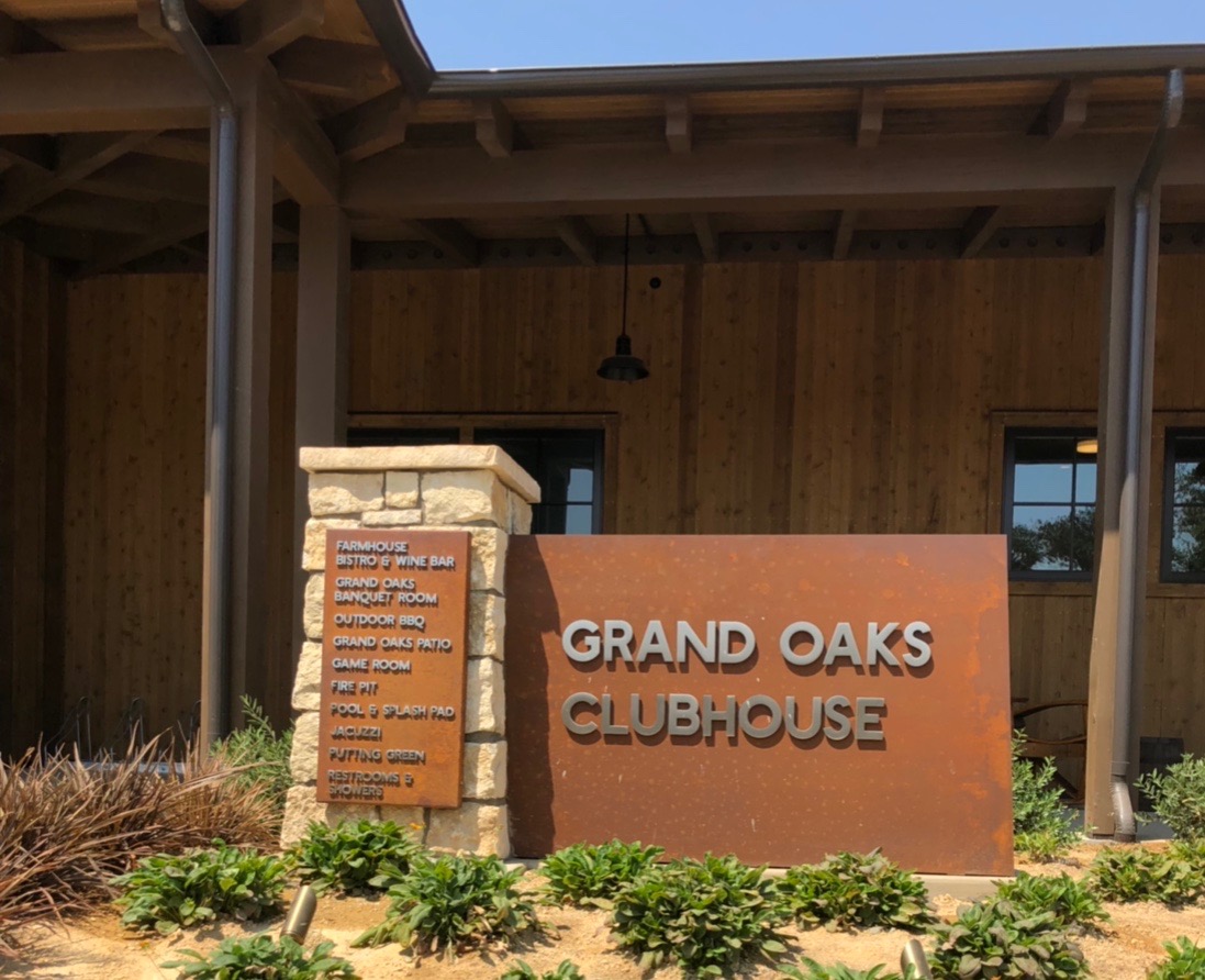 Go through an outdoor gate attached to the pool and you’ll find the Grand Oaks Clubhouse Patio.