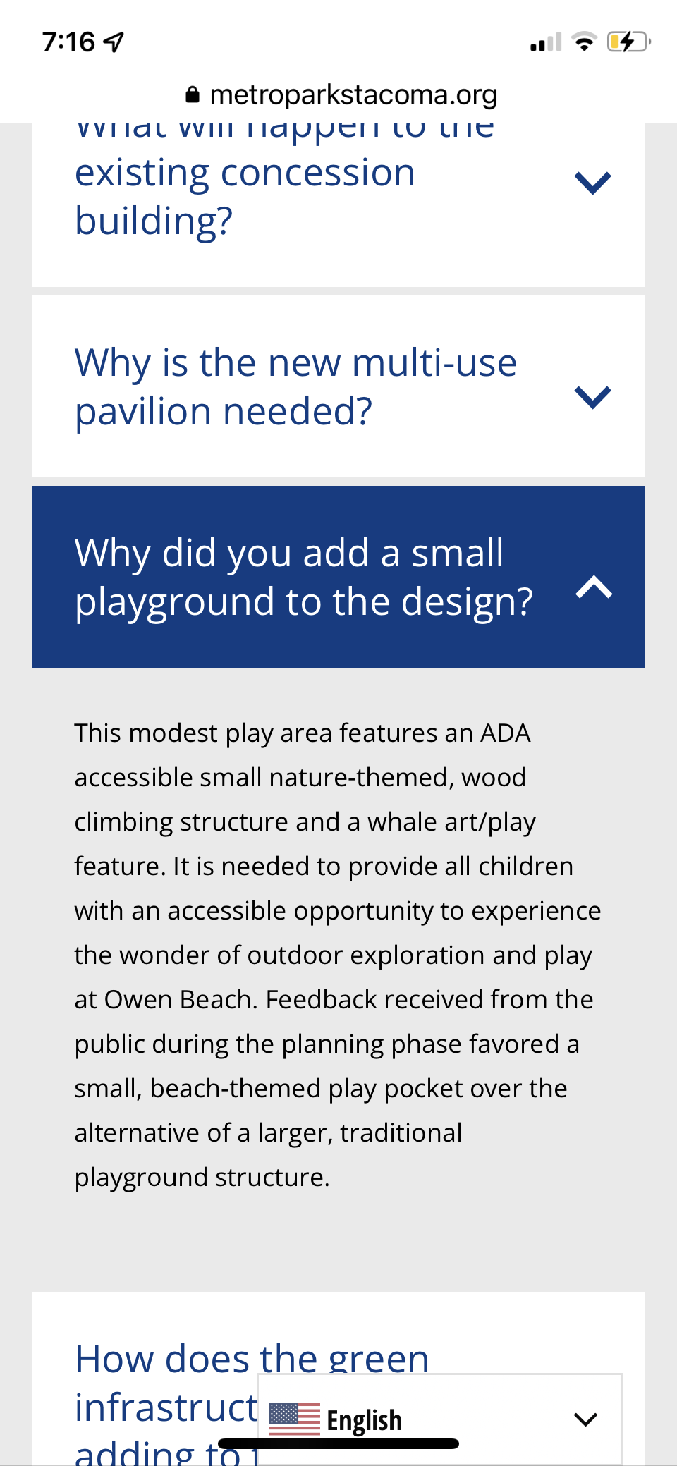 “This modest play area features an ADA-accessible small nature-themed, wood climbing structure and a whale art/play feature. It is needed to provide all children with an accessible opportunity to experience the wonder of outdoor exploration and play at Owen Beach. Feedback received from the public during the planning phase favored a small, beach-themed play pocket over the alternative of a larger, traditional playground structure.”