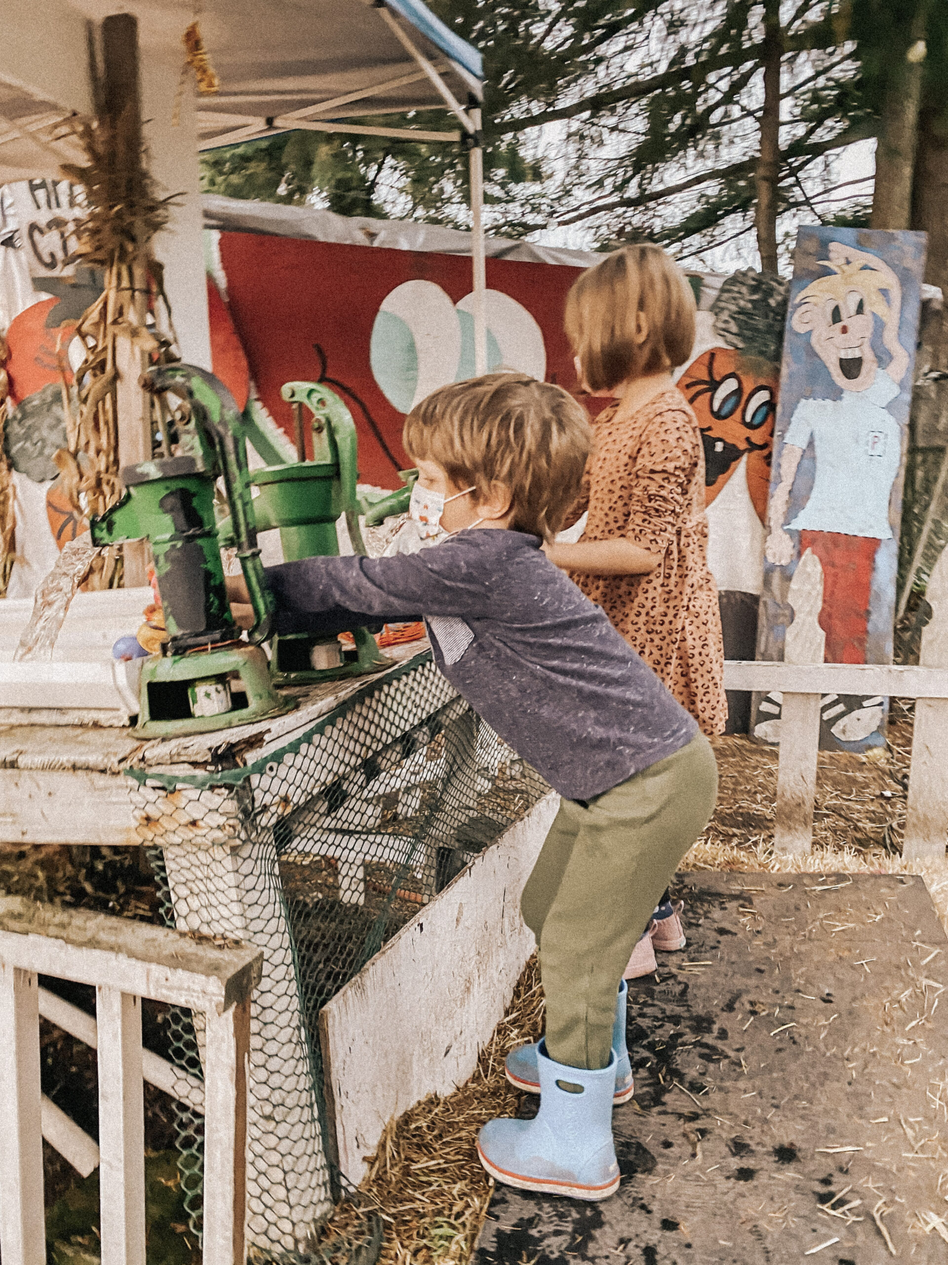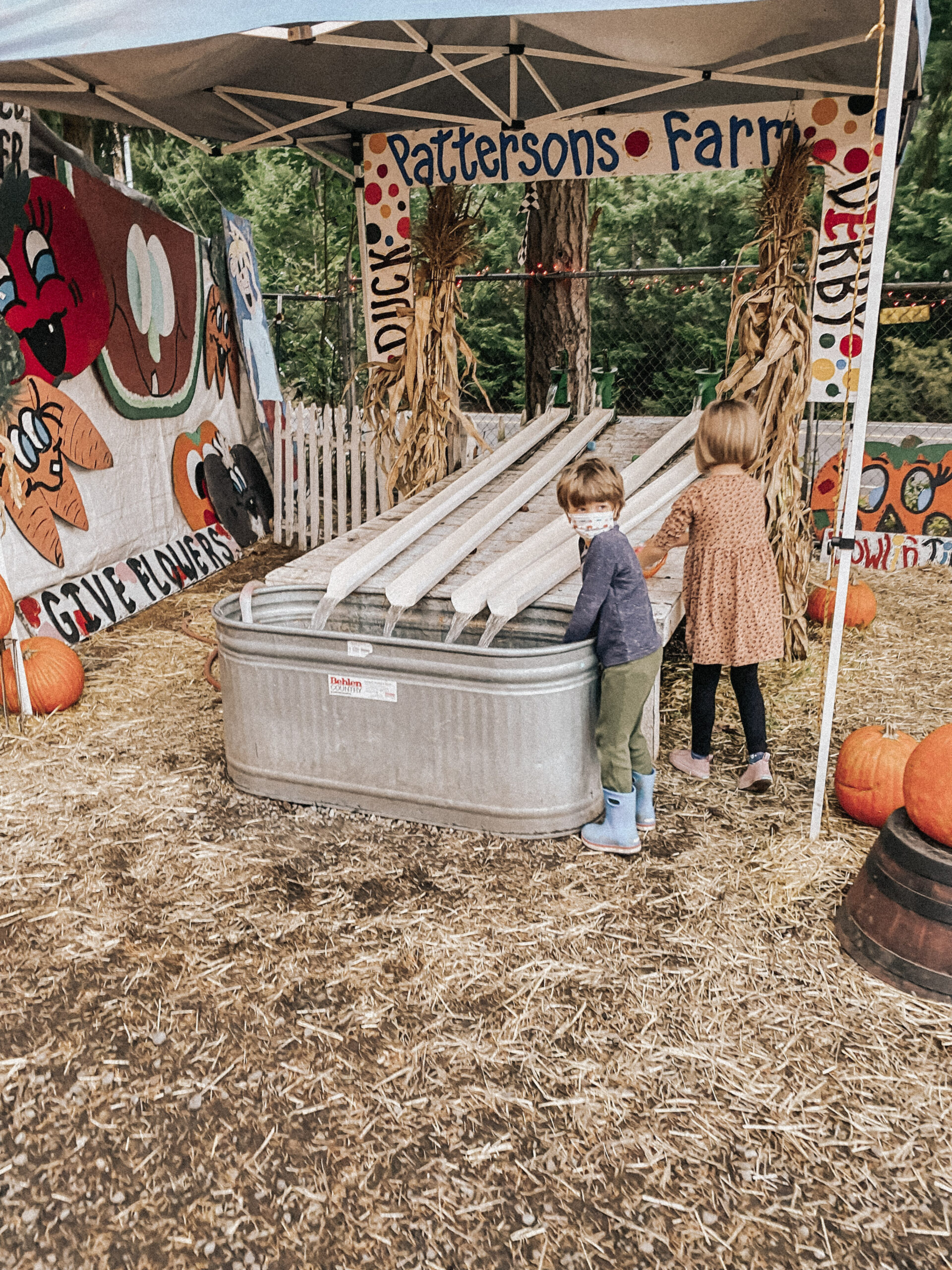I took the kids to Patterson’s just before the weather turned from cool/late summer to fall/rainy. In fact, the first rain fell as we were heading back to the car! We were delighted to find Patterson’s October attractions offered a little bowling game, rubber ducky derby water spout races and a ball toss game. And it’s all free. And … all pretty adorable. 🍿🎃🌲. As well as pumpkins for sale and handpainted signs for photo ops.