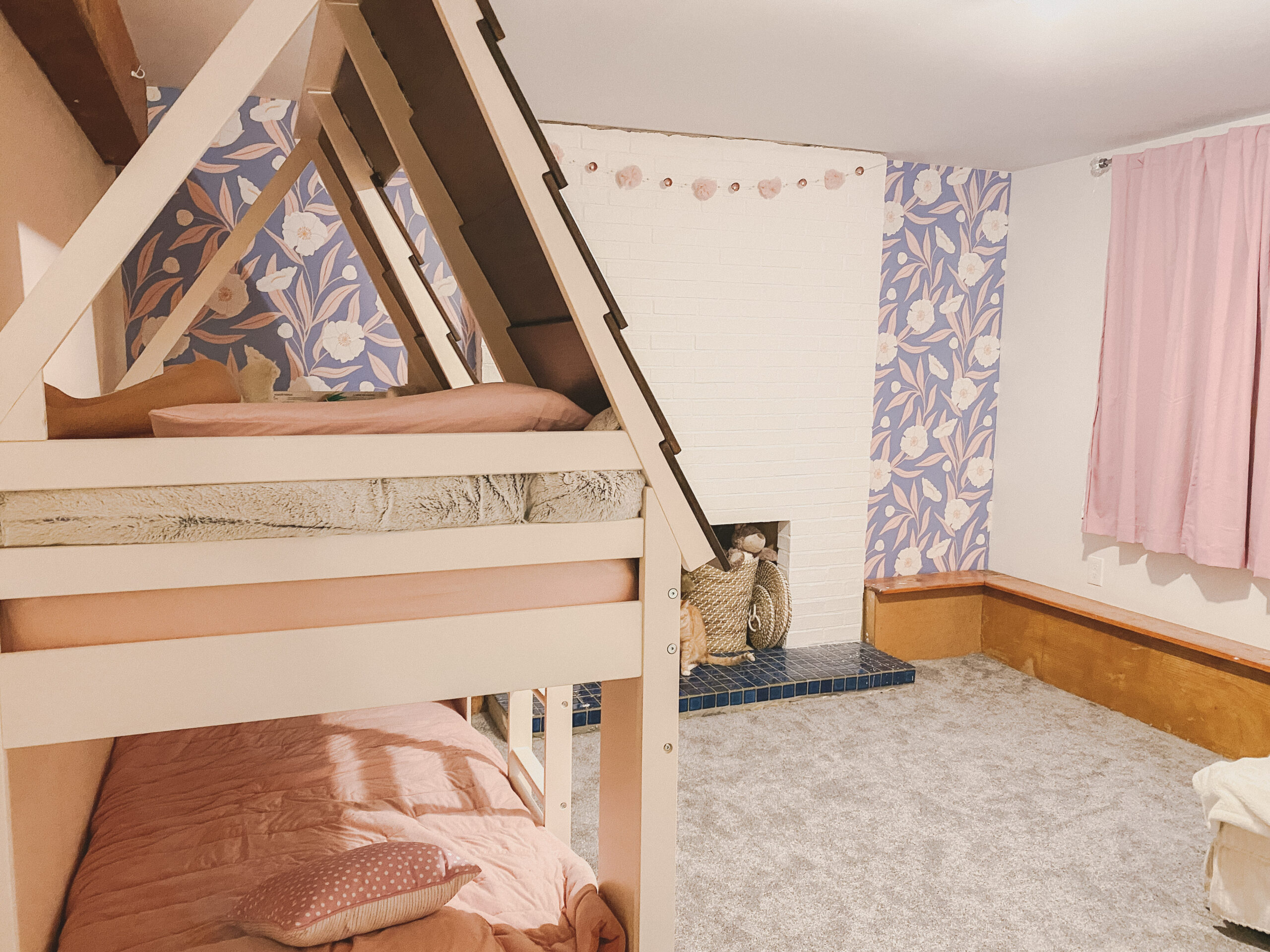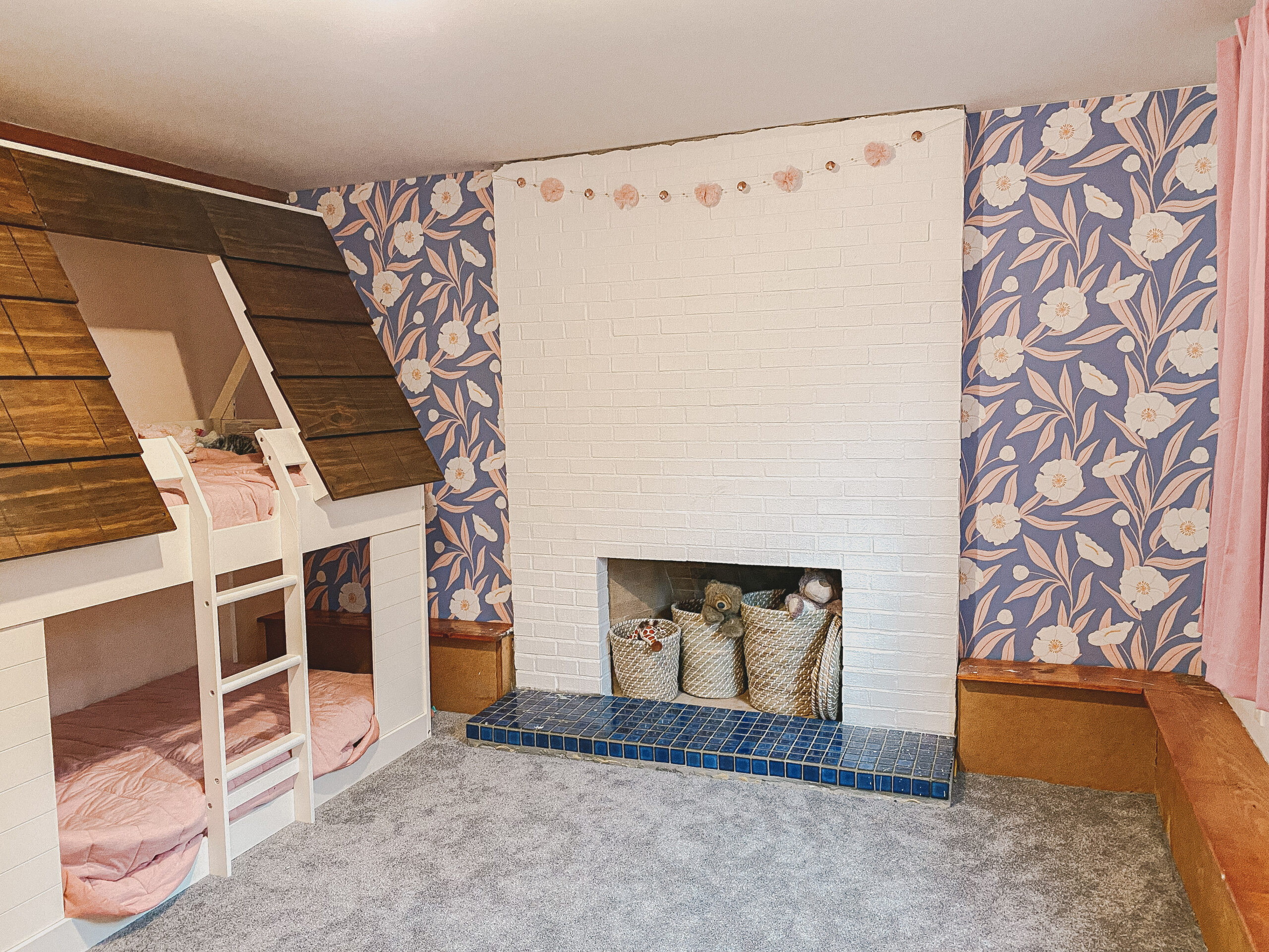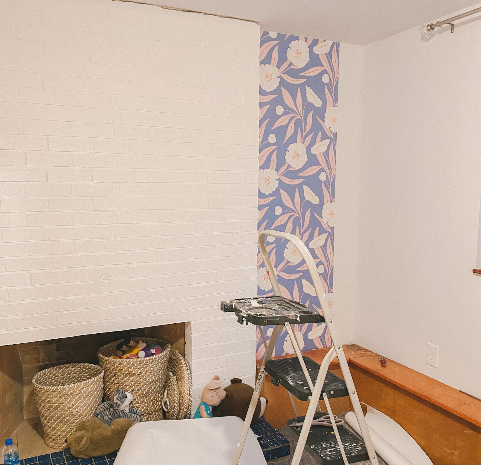 When we first moved to our new house, I knew the downstairs fireplace was going to be special. It just needed a refresh. I’m happy to report that four panels of @lovevsdesign’s Custom color peel and stick removable wallpaper in the Magnolia Tree print did just the trick!