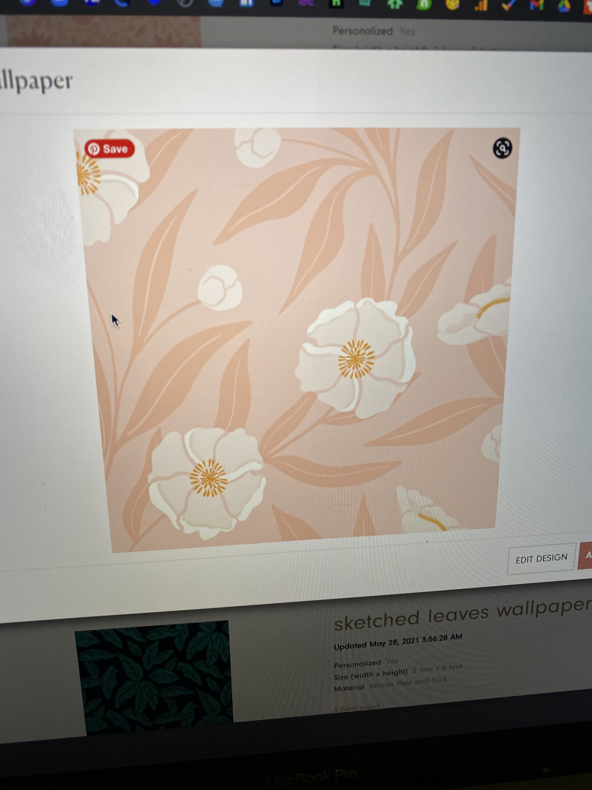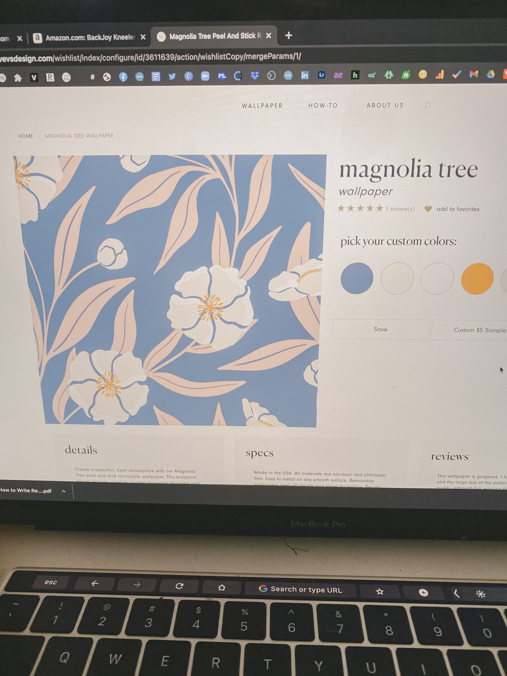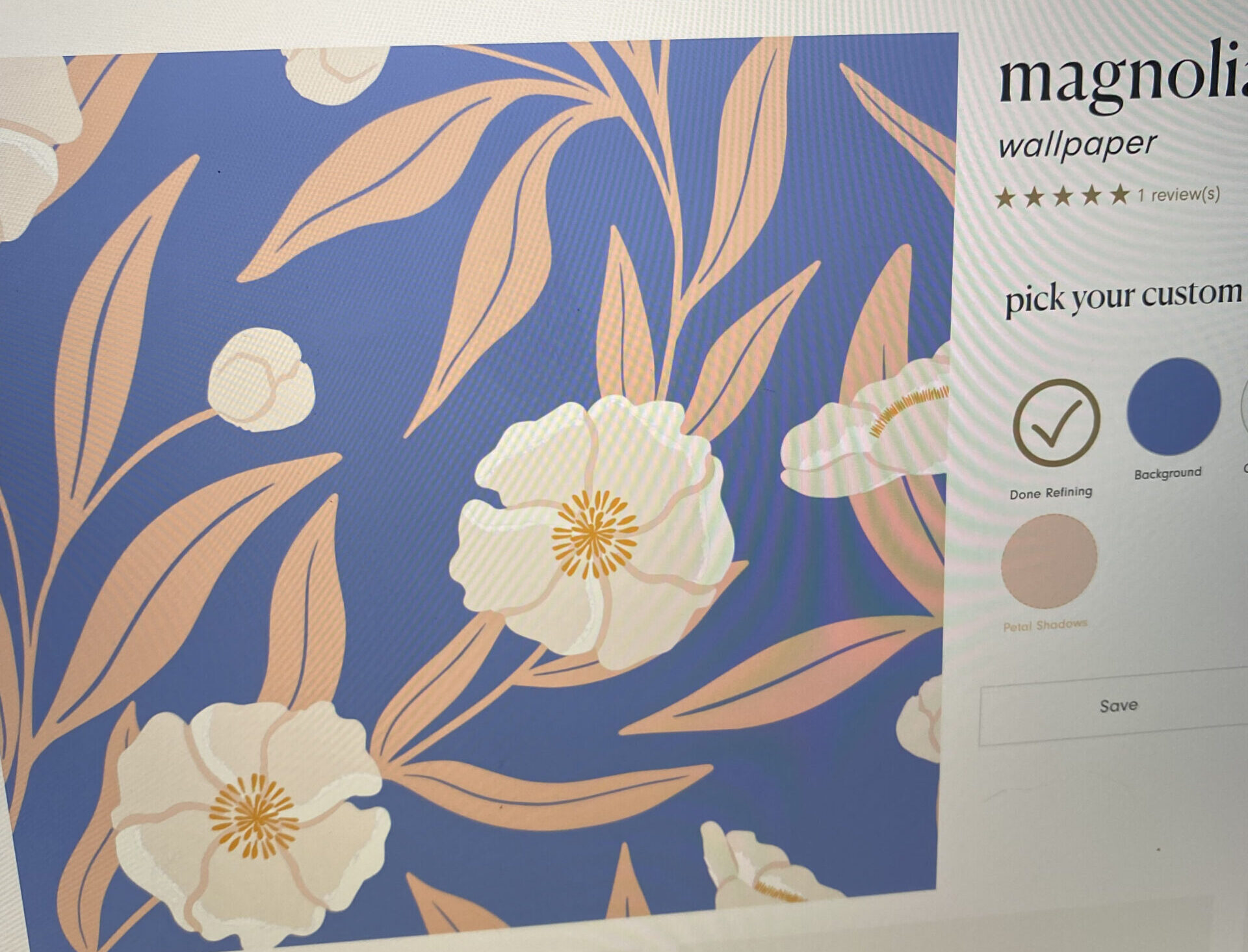 In fact, she helped me pick the colors right off lovevsdesign.com on my laptop one night. The original design, titled “Magnolia Tree,” came in green tones. It featured a “botanical design (with) playfully painted magnolia blossoms and branches laid delicately over a soft green background.” The names on the original color palette were “fir” for the background, “tidal” on the leaves and “grain” washed across the flowers: