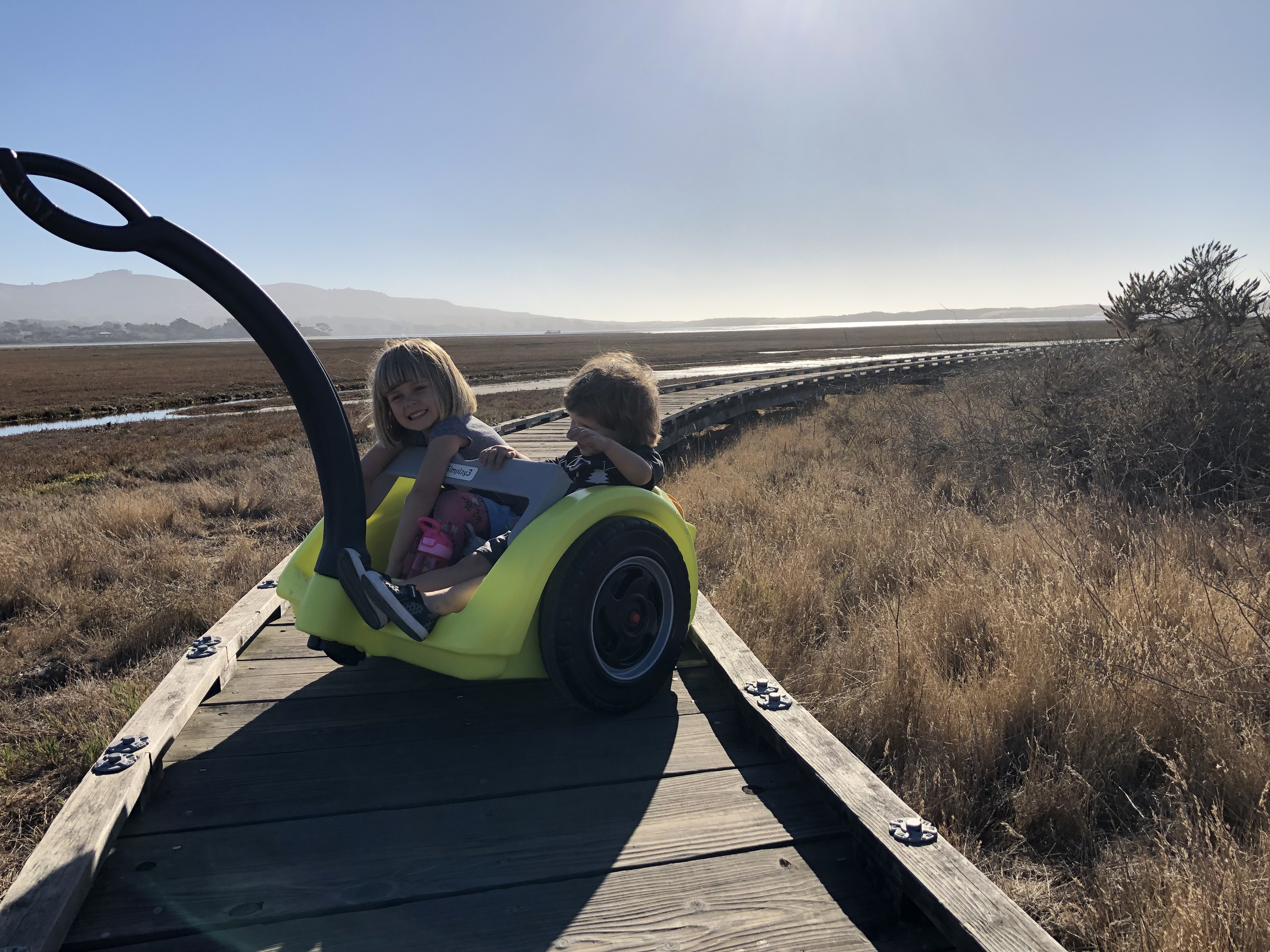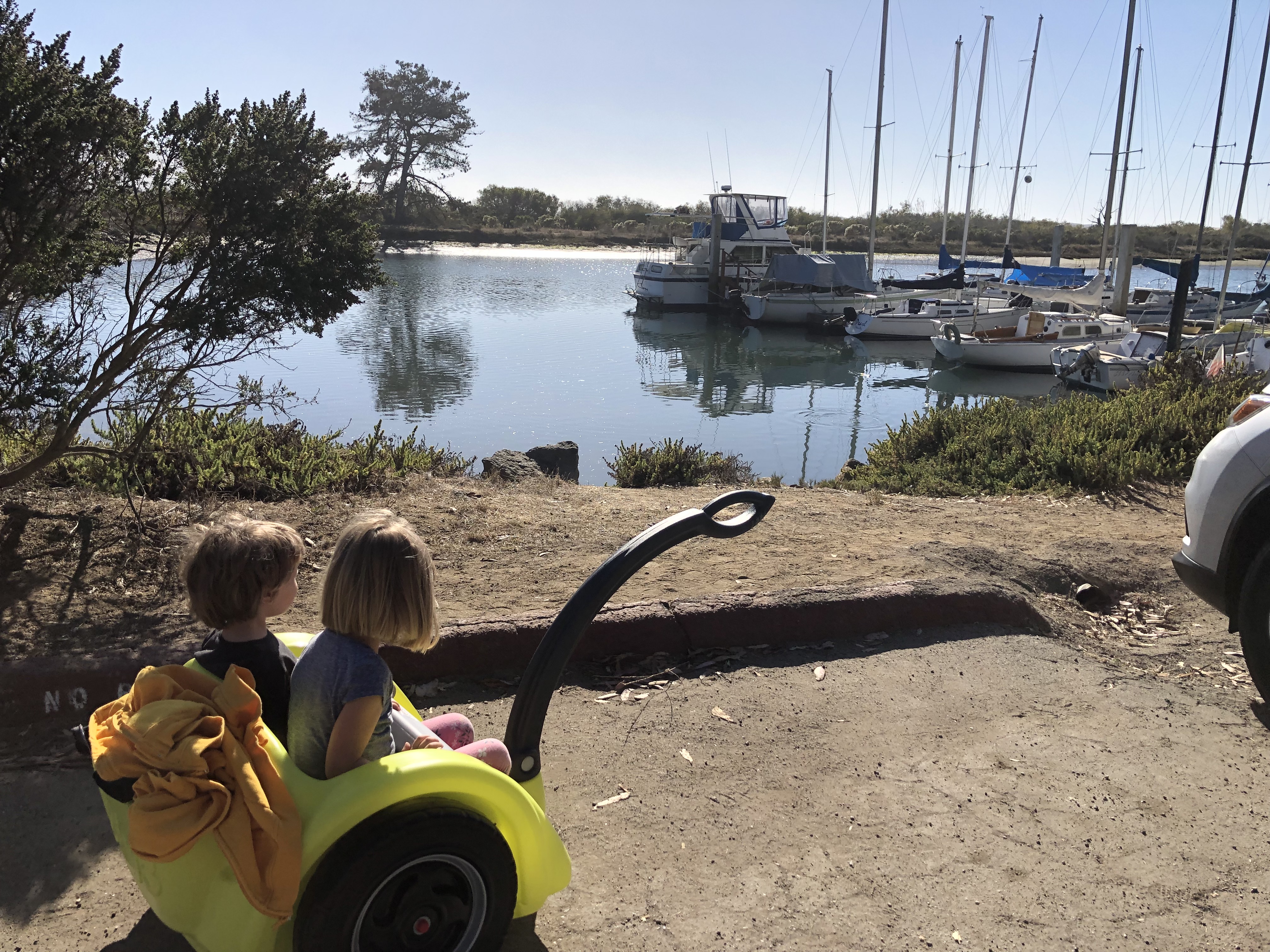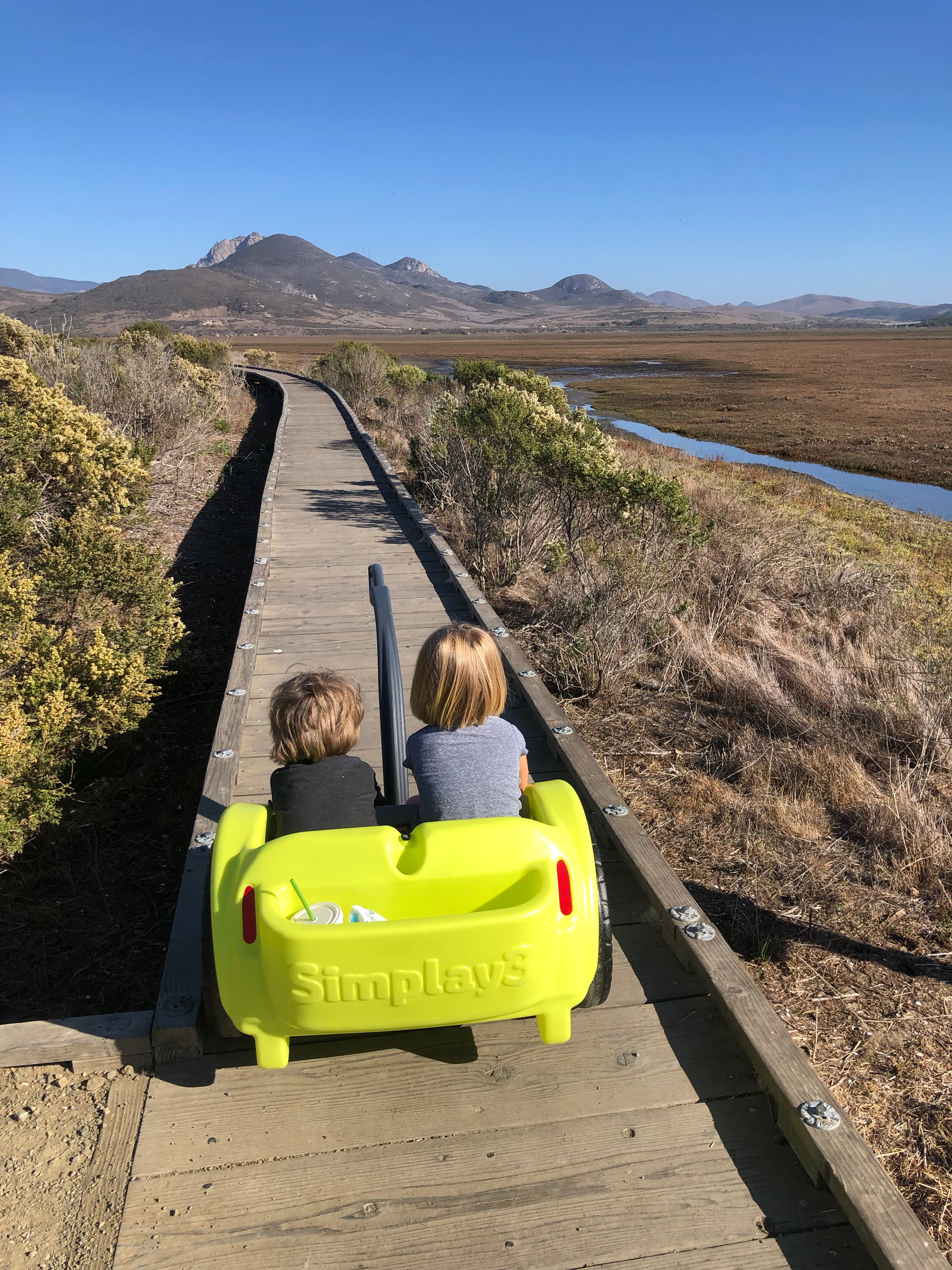 This Central Coast fishing town is about 40 miles west from our house in inland Paso Robles, so it makes for the perfect day trip. I have thoroughly explored Morro Bay in the past, (check out my Morro Bay Embarcadero With Kids post here). But when I went kayaking with my tourism crew this summer, I spied the boardwalk trail way over on the south side, and I had never known it was there. The trail meanders offshore in a much smaller part of the harbor and leads hikers to an overlook of the estuary. I had always wanted to go back there to test out the walk with the kids. And the wagon was the perfect addition for such an adventure.