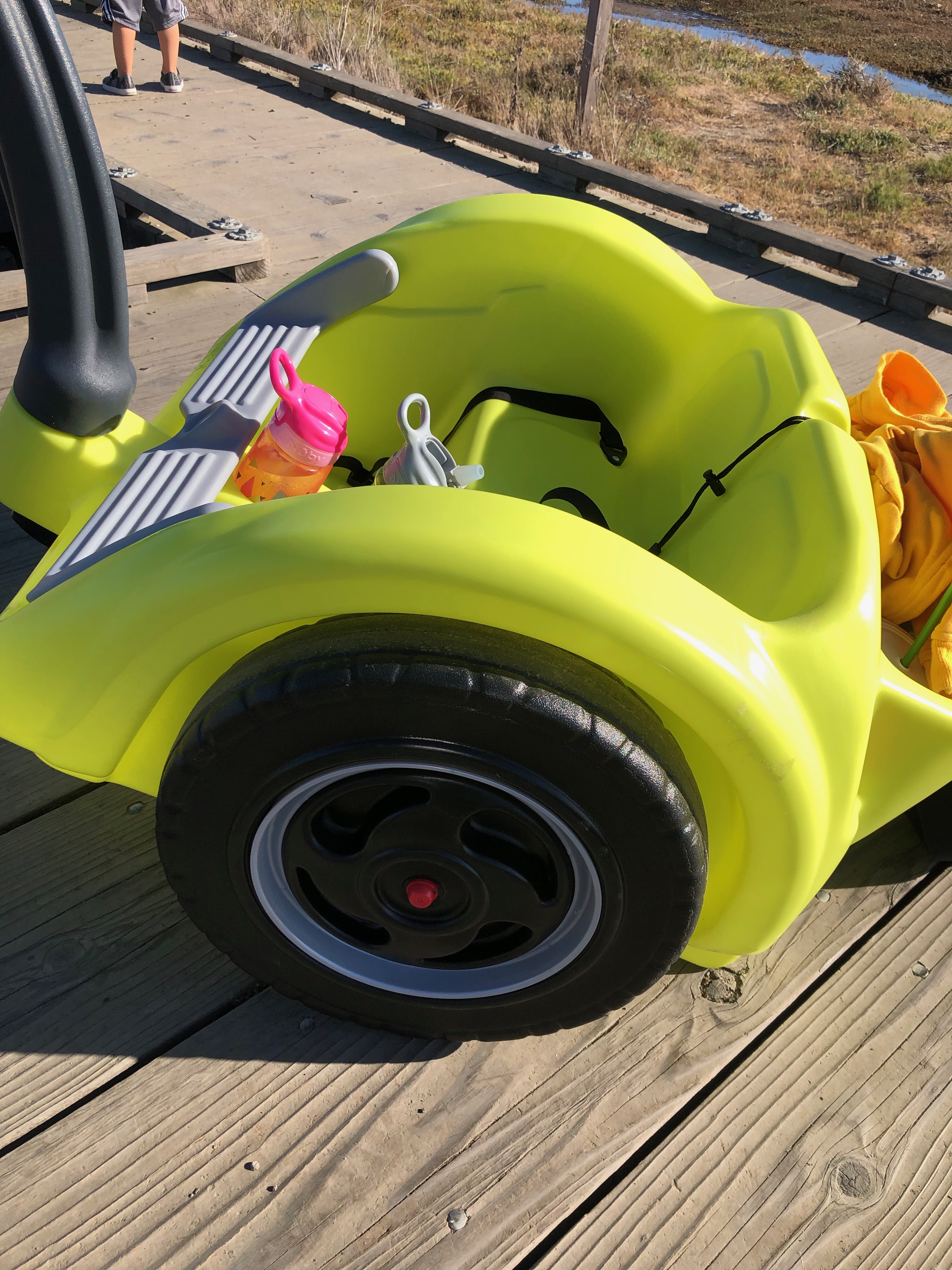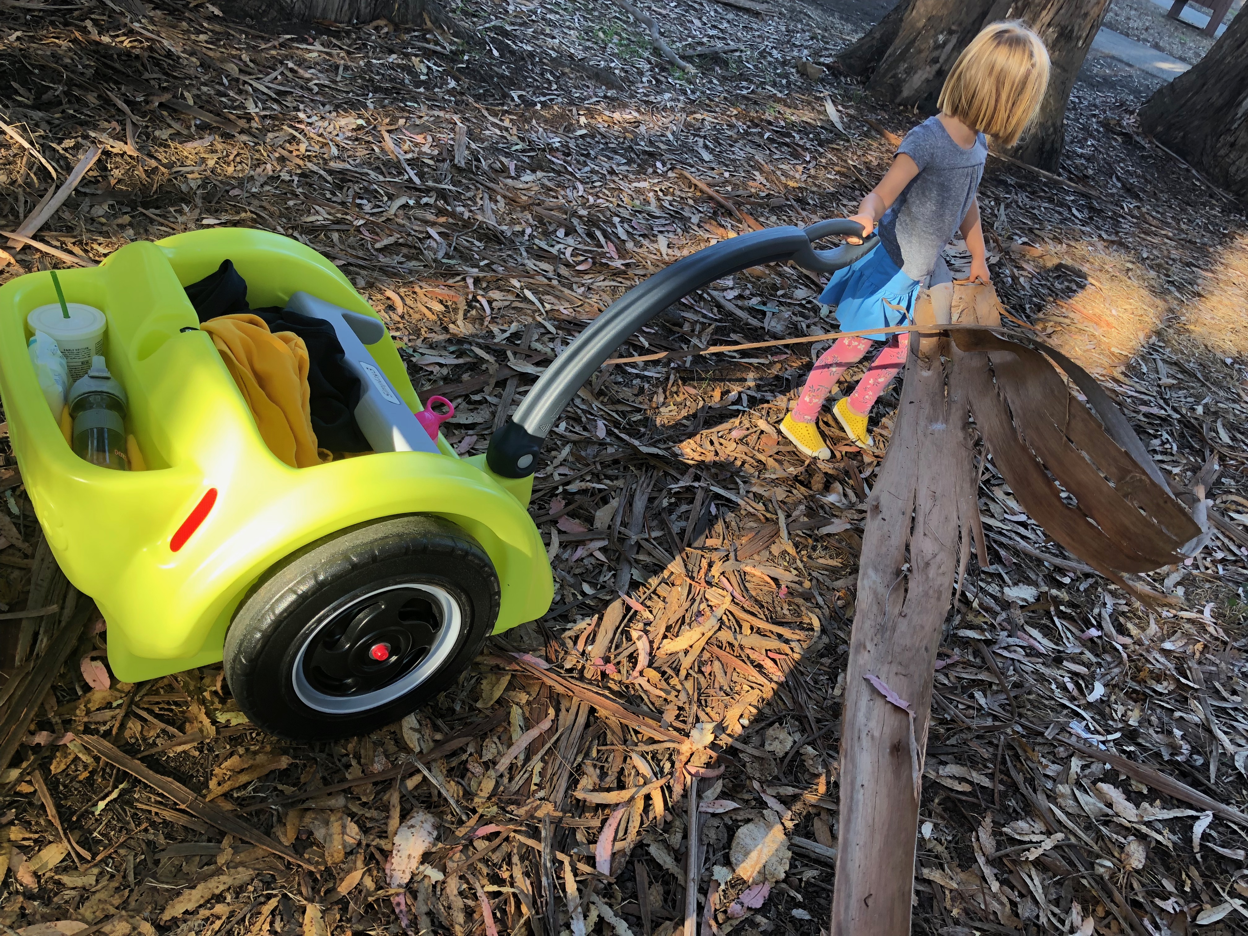 For us, these plastic wheels boasted an extra-wide shape that easily rolled over soft dirt, crunchy fall leaves, bumpy boardwalk slats, rough asphalt – you name it. In fact, the whole toy is super easy to navigate. It’s great on tight turns, specifically. We even were able to make several u-turns on the narrow boardwalk which I was surprised about. It also didn’t feel heavy to pull behind me. Clara was even able to pull her brother around.