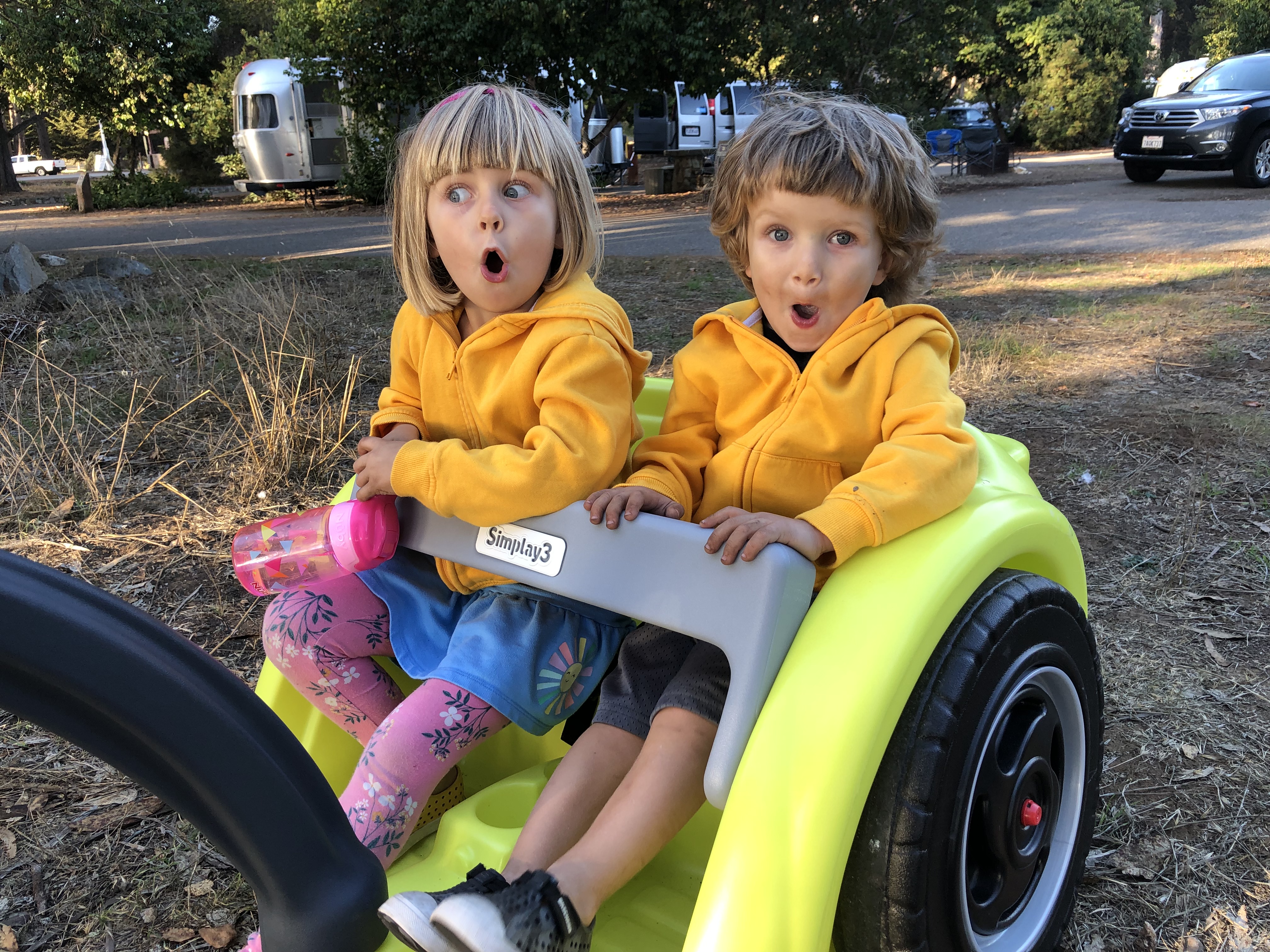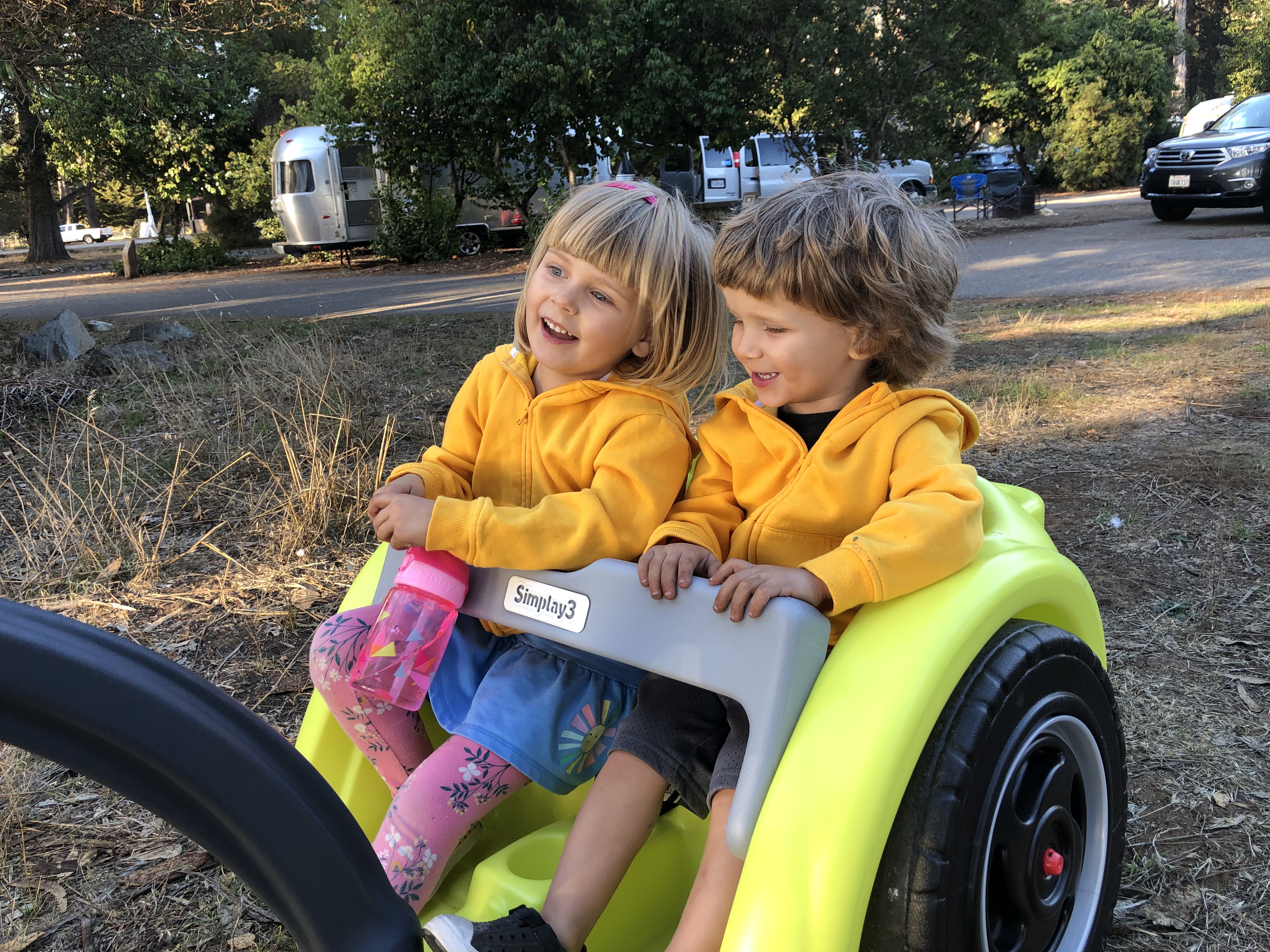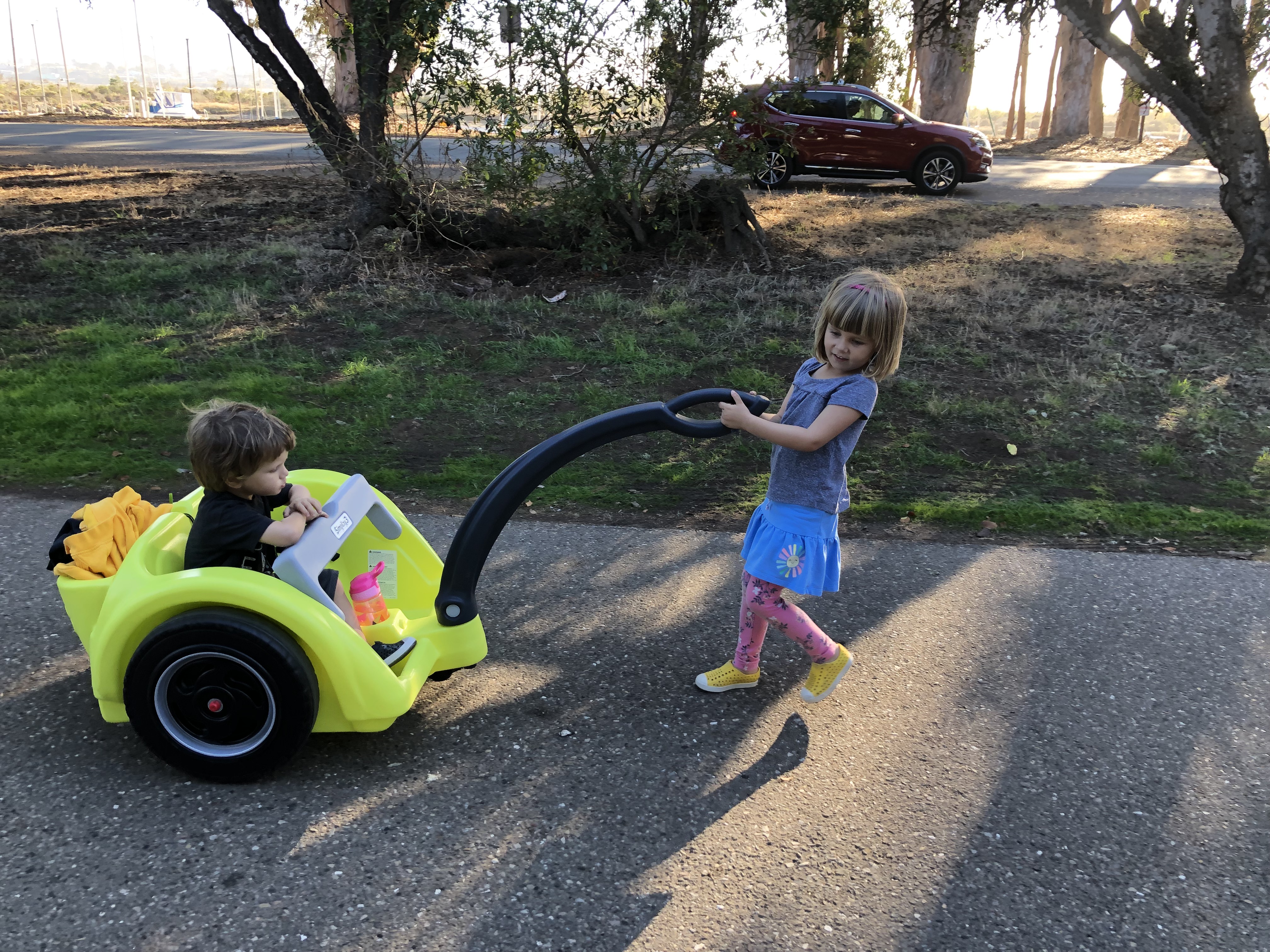 At age 2 and 4, the kids and I just started to ditch the stroller for our outdoor walks, which is a major milestone. I was never big on stroller walks anyway, because when the kids were smaller they would always whine for snacks and water cups (and toss said cups on the ground). So the walks were SUPER SLOW, and kind of drove me crazy. So then came the plastic push-bike era, which was handy for wrangling the baby but big sis got jelly and two kids didn’t fit on one bike, and I couldn’t push two by myself.