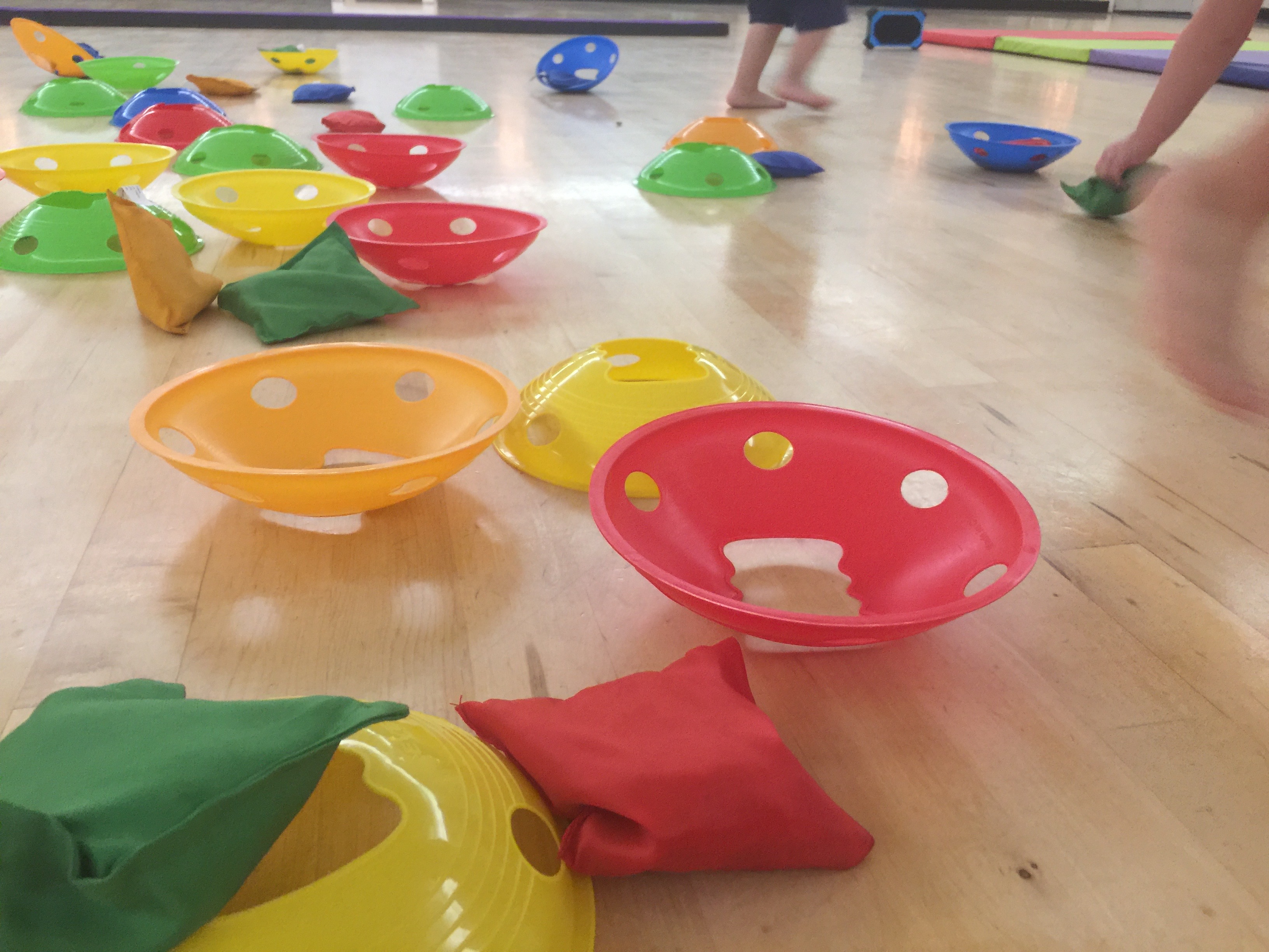 Then they had some relay running games, followed by a circuit line of jumping, tumbling and balancing. After that I have no idea what they did because I was chasing the baby around. By the time we got back, they were playing freeze dance and soon got into a floor circle again and handed out little sticky hand toys as take-home gifts.