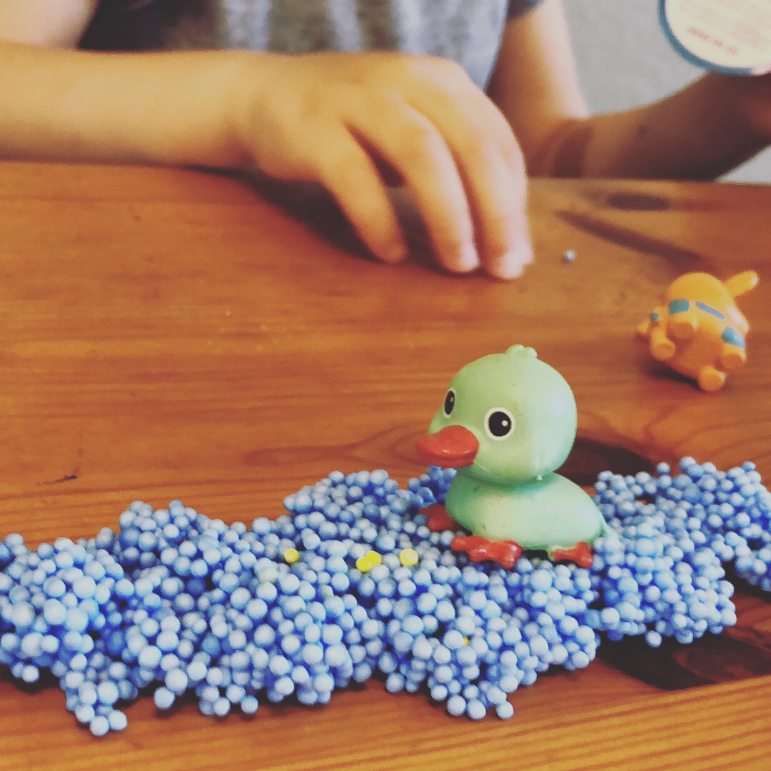⋙ Adding an animal toy to the Playfoam experience is fun bc then you can sculpt little accessories for them. We made little houses, caves and beds. My daughter also molded a long meandering blue river for the platypus!