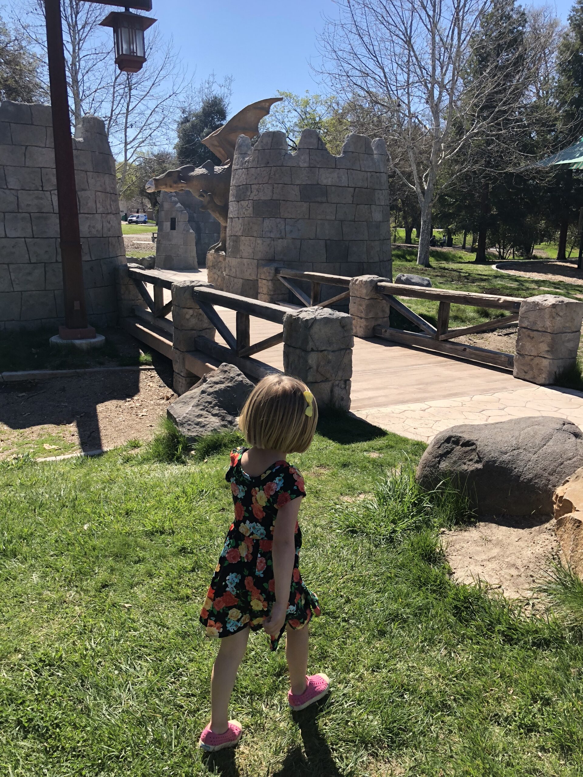 Run by the City of Paso Robles, Sherwood Park stands out for its life-size dragon statue! There are also two castle towers (one w/a little wooden door that you can’t go into, unfortunately), a bridge, and a fairy tale throwback to the sword in the stone.