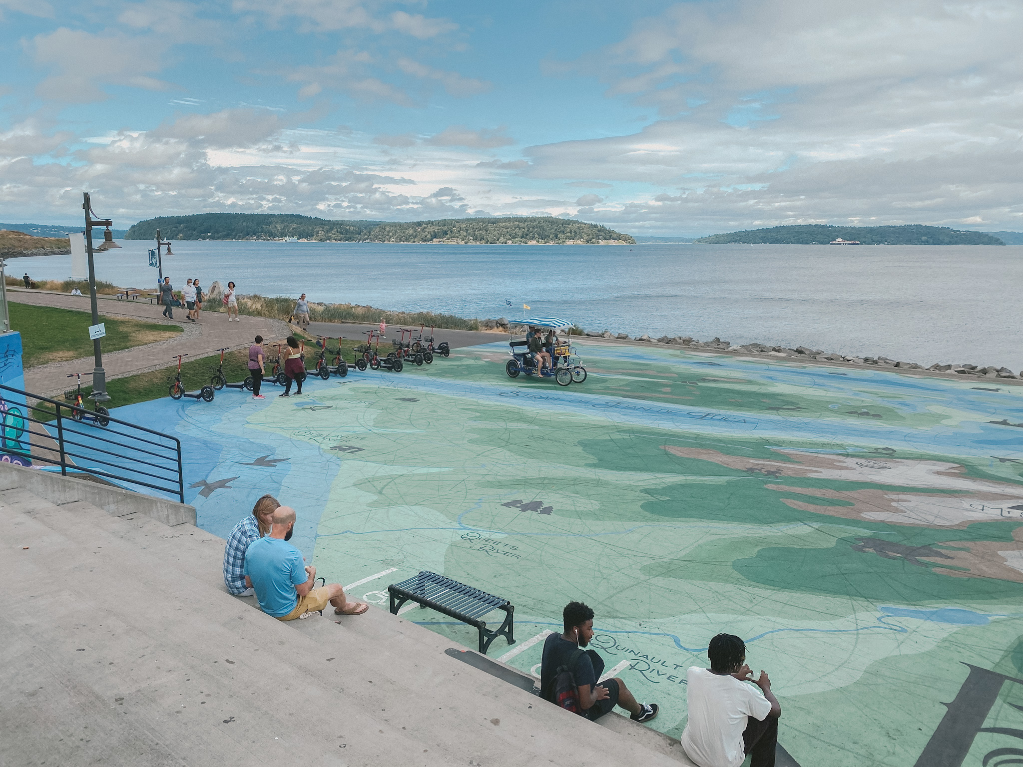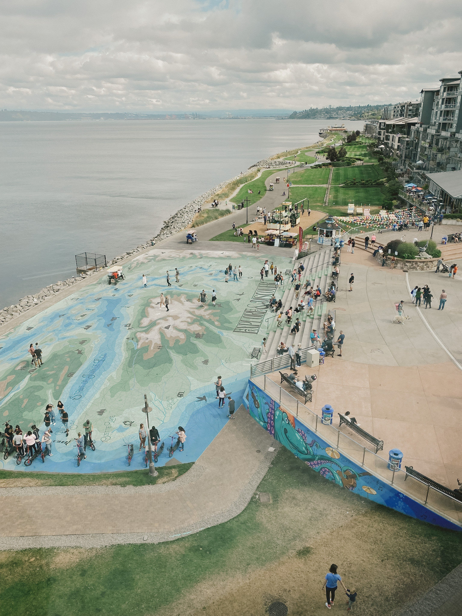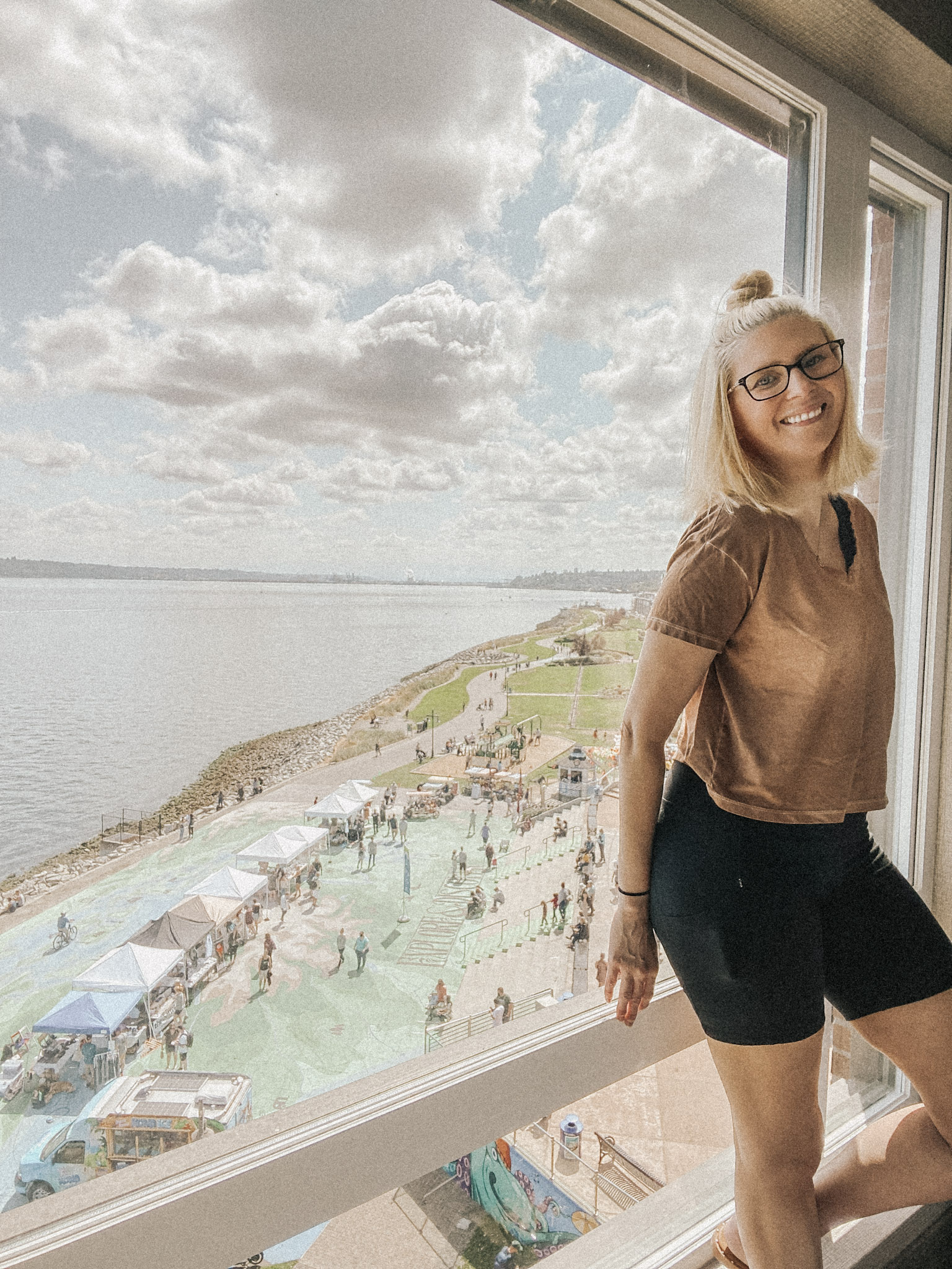 Funny story: Our view spanned a corner of Grandview Plaza. On Sunday morning, we sipped coffee and from our bedroom window watched small shops and vendors set up for the Tacoma Summerfest Pop-Up Market in the plaza. Bowen and I spied one dude who was really hustling to bring in box after box of merchandise up and down the (many) plaza steps from the parking lot. Later, I searched the Point Ruston geotag on Instagram to see who all was there, and I found a post from box dude!! Turns out, he was with the t-shirt/hat shop @mtrainierwatch. I decided to go full psycho and comment on his post that I spied him setting up the booth from our hotel window LOL. Luckily he messaged me and thought that was cool. 🙂 And I did, too.