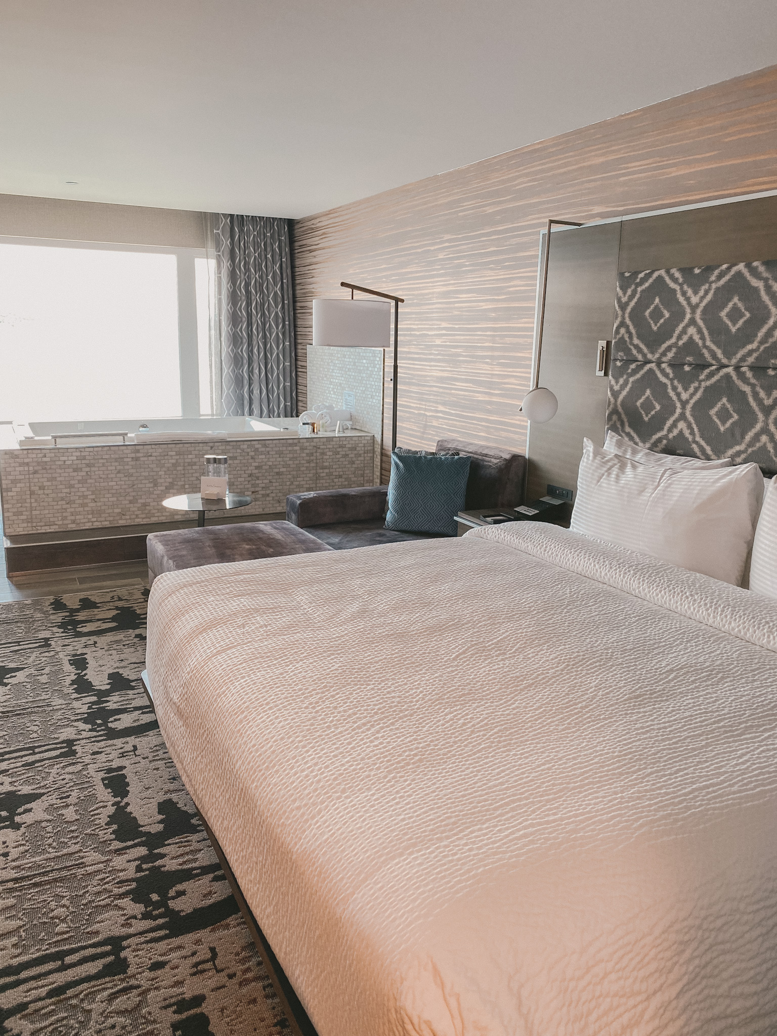 We partnered for a media stay in a Water View King Jacuzzi Room, which is one of its upper-tier rooms and totally worth the extra money for the relaxation factor. You get a jacuzzi INSIDE your room! And that’s not just a jacuzzi tub in the bathroom — it’s a full-on spa next to your king-sized bed.