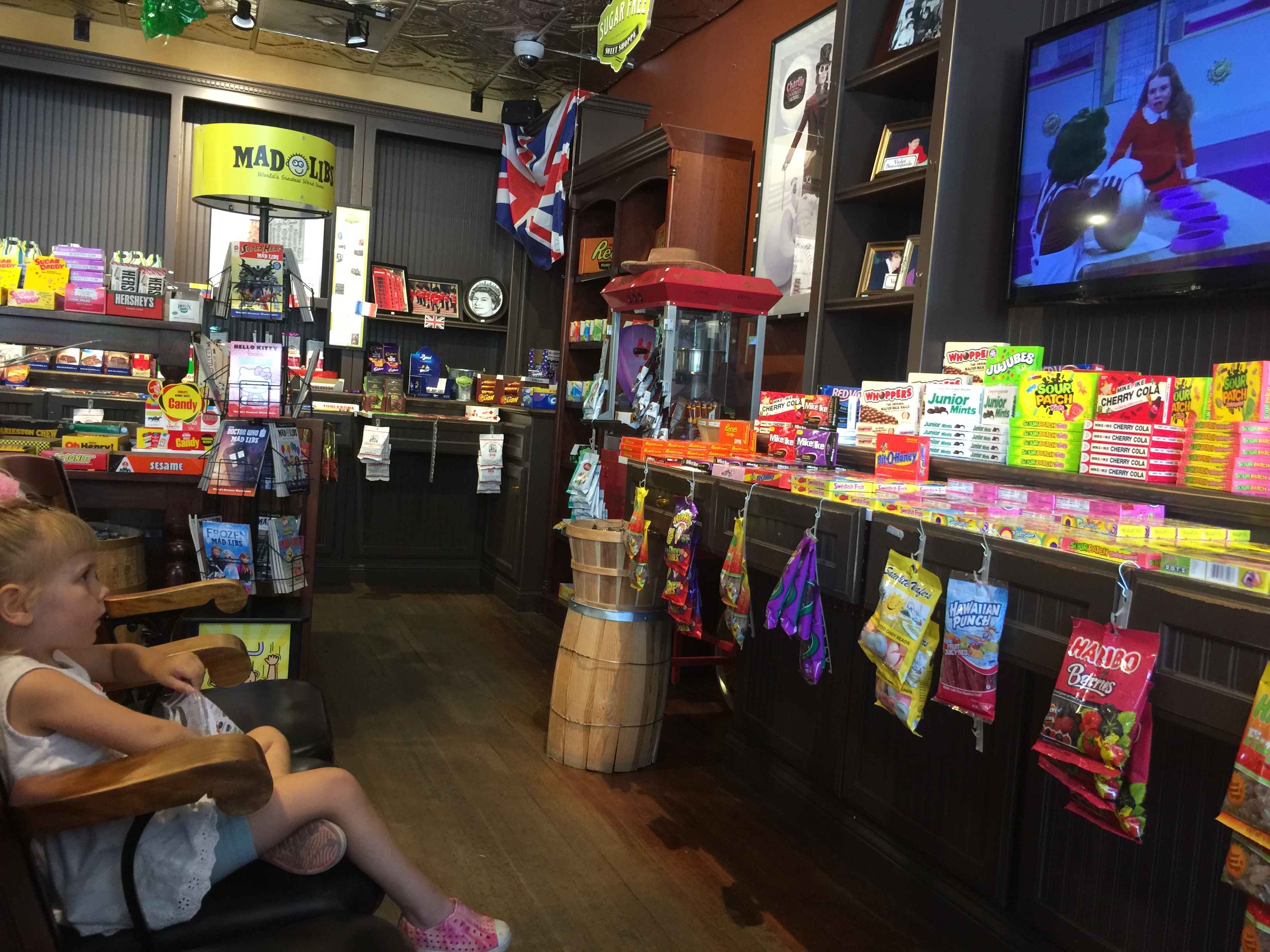 After we pay for our goodies, we eat them right there inside the store! And that’s because the shop has the 1971 cinematic classic “Willy Wonka & the Chocolate Factory” playing on an endless loop.